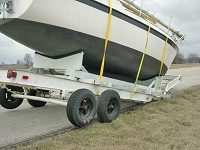 Waking to a clear and sunny blue sky, we headed down to Torreson Marine where the boat had been purchased. We had arranged for the boat and trailer to be waiting for us in the yard, with the remaining gear being brought down later in the day. Although Torreson Marine had assured me a number of times the trailer was solid and we would have no problems returning to Canada, my buddy set to work checking tires, bearings and replacing one of the signal lamps that was smashed at the back. I set to work strapping down the mast, stays and anything else that might flap around during the long trip home. Even though our truck had a towing package, we discovered it did not have an electric trailer brake module. Wasting a few hours driving around, we eventually found one and installed it. Each hour that passed it became colder and more cloudy out and by the time we were hooked up and ready to go, it was after 6pm. Hoping to knock a few hours off the trip home we set out, soon to be met with rain and high winds. Slightly north of Benton Harbor we blew a trailer fuse and had to turn off the highway. The wiring on the trailer was shorting out somewhere so we would have to find a motel and fix the problem first thing in the morning. Lucky for us we found a beautiful motel that had just opened and had special grand opening rates. It was the nicest place we stayed the entire trip.