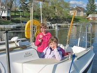 Late to bed and early to rise... makes for a sleepy sailor, thanks to spring allergies. Anyway, I spent the morning tracking down new plugs for the motor. Not being mechanically inclined, the best I could do was make sure we had new gas, oil and spark plugs. After many failed attempts with the pull cord I gave up and went looking for help. The final solution was to pull the motor off to have it looked at (professionally) and use a borrowed motor to get home. By 3pm we were boarding (minus one son due to a birthday party) and with a last look at the harbour we set off. The girls enjoyed the trip and had fun coloring below as well as checking out the view from above. We arrived at our dock 2 hours later and as future reference, our 25' is about 3000lbs. heavier than our 21'. This translates to "a lot more momentum"... when coming into dock, slow the boat down a lot sooner!
